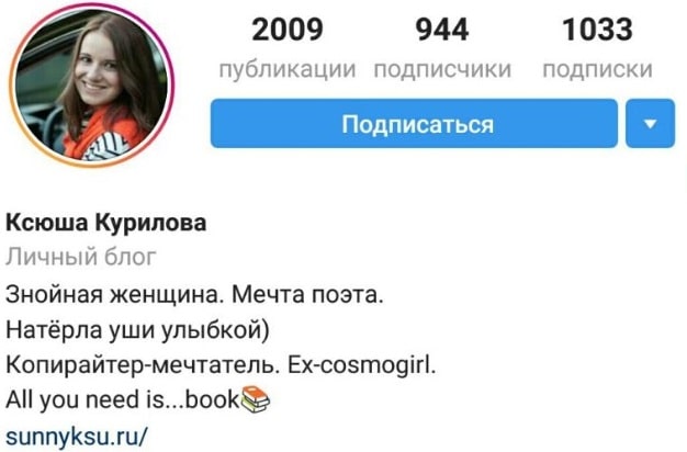 Описание профиля задает «тонус» всему аккаунту. В эти первые приветственные строчки нужно умудриться вложить тонны информации о себе, сфере своей деятельности, подать это все юмором и смайлами по желанию. Идеального рецепта для привлечения миллионной аудитории подписчиков нет. Статистика знает множество профилей, заполненных с учетом всех маркетинговых уловок с минимумом читателей и аккаунты с миллионной аудиторией, владельцы которых называют себя бездарями, алкоголиками и гангстерами. Можно сказать, что все сугубо индивидуально и главное найти свою “фишку”. Но некоторые успешные примеры все же можно взять на вооружение.