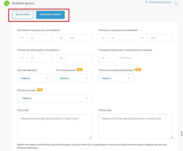 Для того, чтобы база инстаграм аккаунтов была качественной, нужно правильно настроить фильтр. Доступны такие параметры: