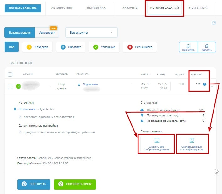 - Результаты экспортируются в файл формата CSV, который далее используется во всех способах продвижения аккаунта.